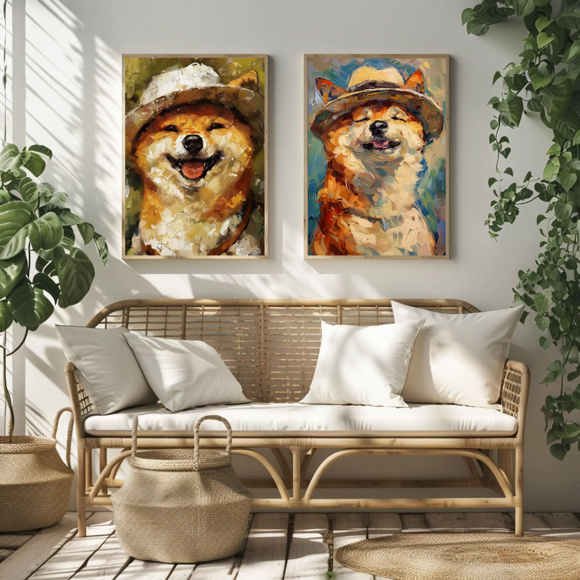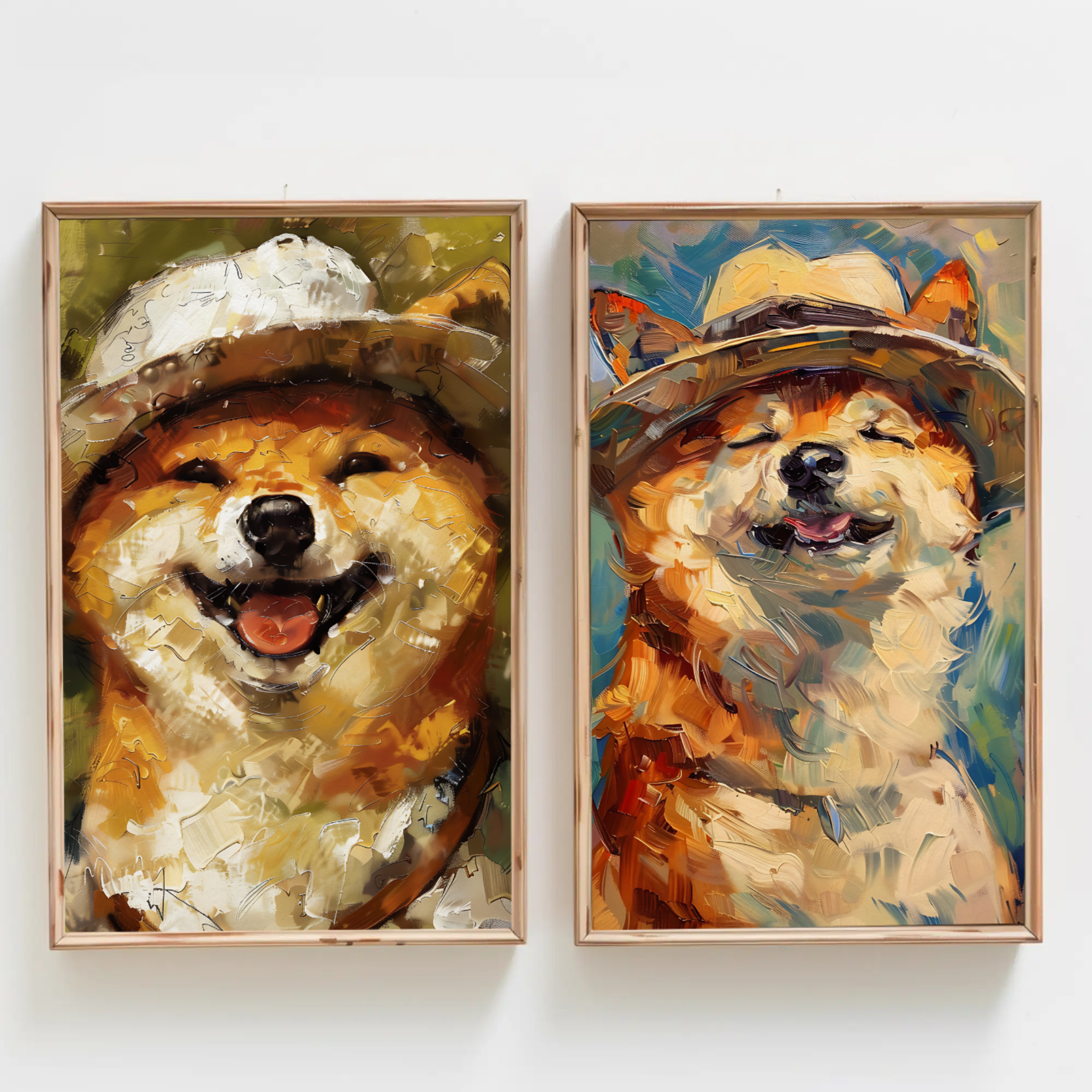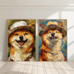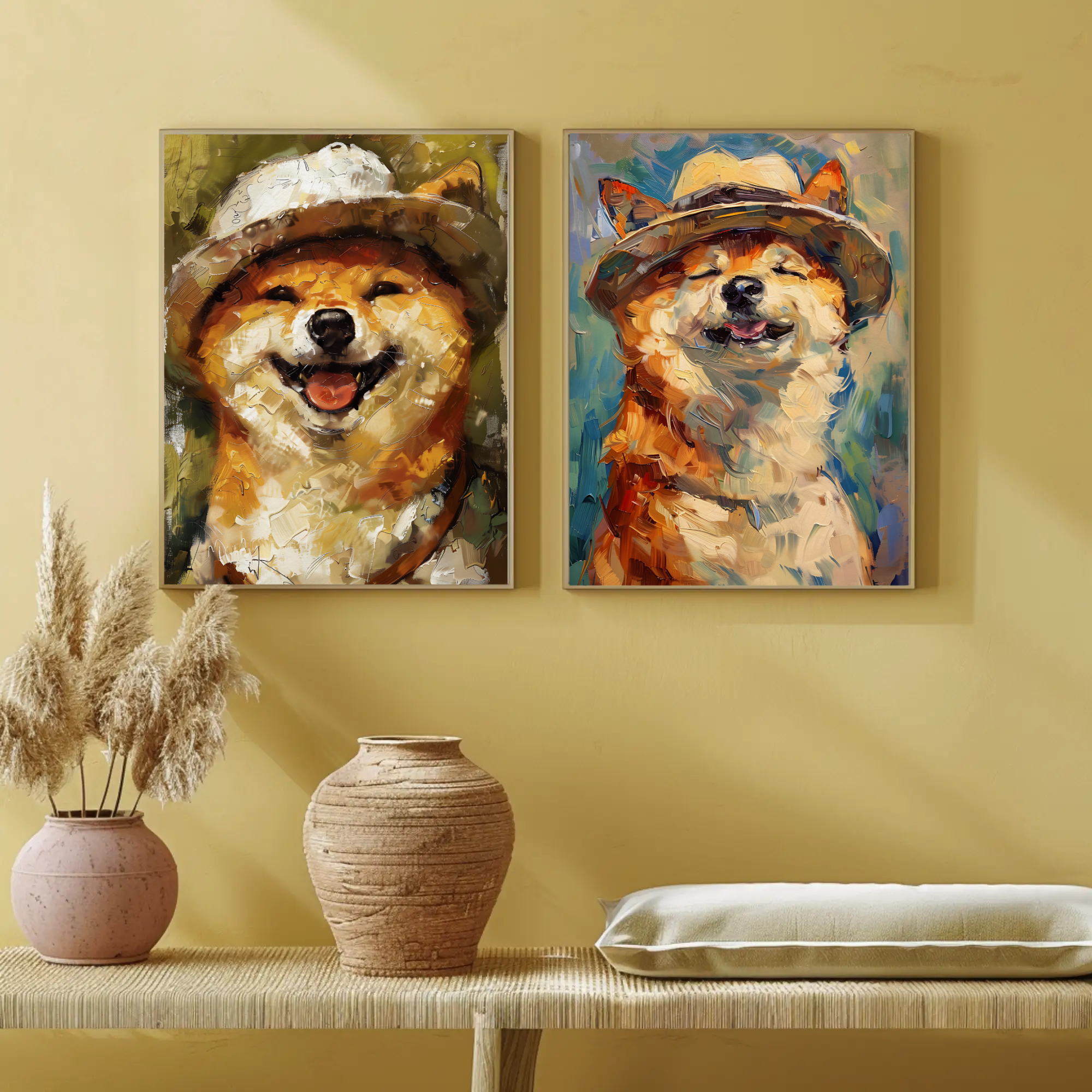 Deux portraits de chiens joyeux coiffés de chapeaux, peints dans un style expressif et texturé — une explosion de bonheur coloré qui réchauffe immédiatement l’atmosphère.