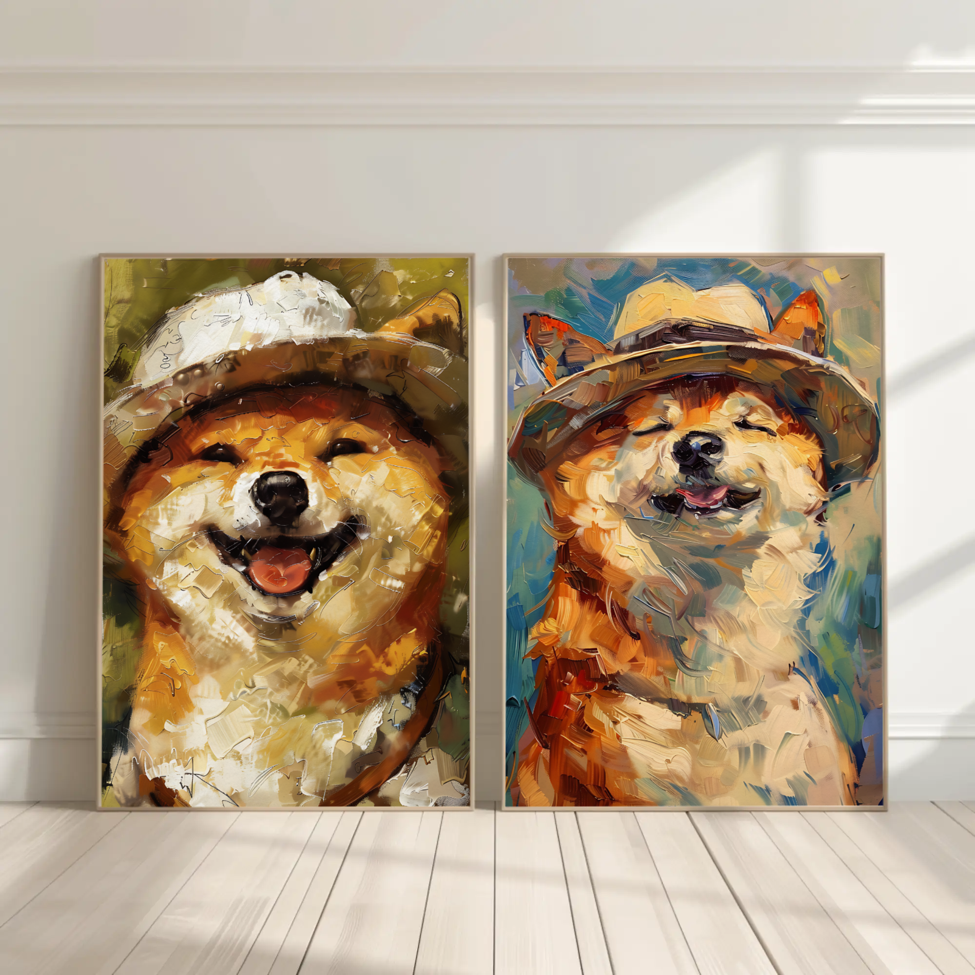 Chapeau Chien est une composition artistique pleine de vie, réunissant deux toiles qui capturent la joie canine dans toute sa splendeur. Chaque portrait présente un chien au sourire éclatant, arborant un chapeau avec fierté, dans un style de peinture gestuelle inspiré des coups de pinceau épais et expressifs de l’art contemporain.