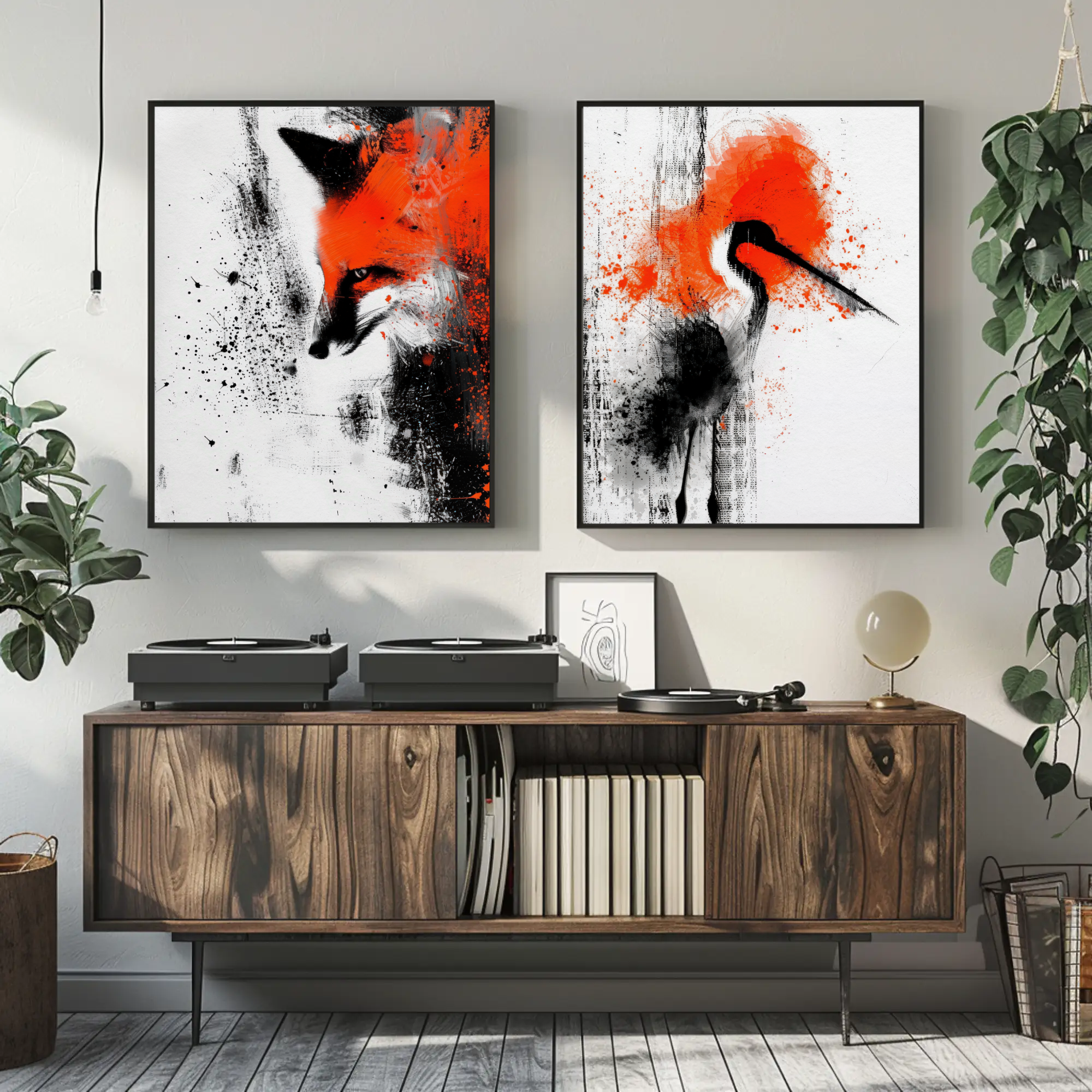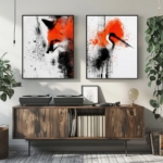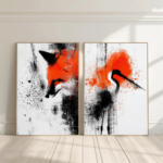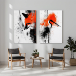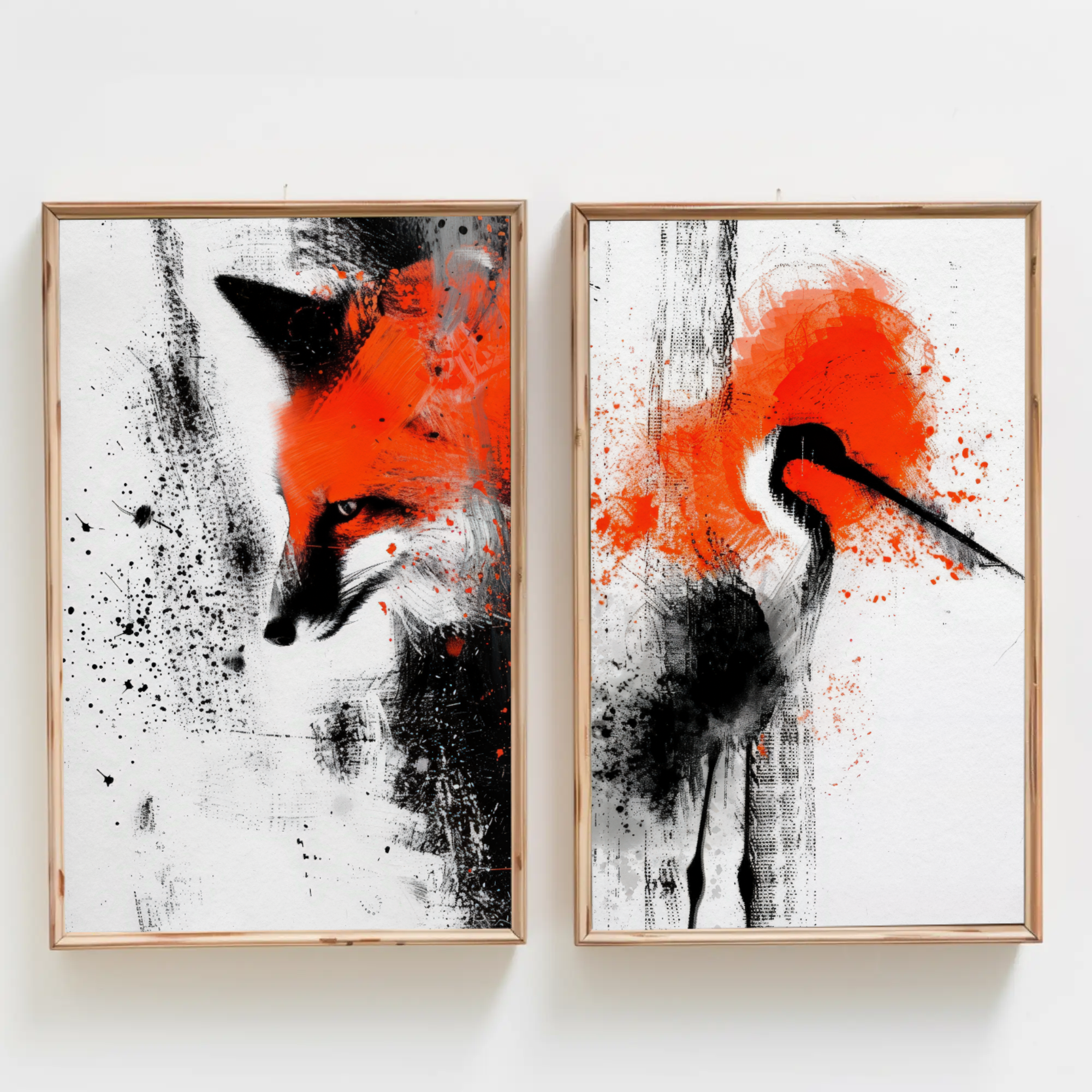 Plongez dans une symphonie visuelle brute et captivante avec Duo Sauvage, un ensemble de deux toiles artistiques fusionnant abstraction et faune avec une audace moderne. Le premier tableau met en scène un renard aux traits à demi dissous dans une tempête de rouge éclatant et de noir en éclaboussures, tandis que le second capture un oiseau stylisé aux mêmes accents chromatiques, comme figé dans l’instant d’un envol.