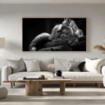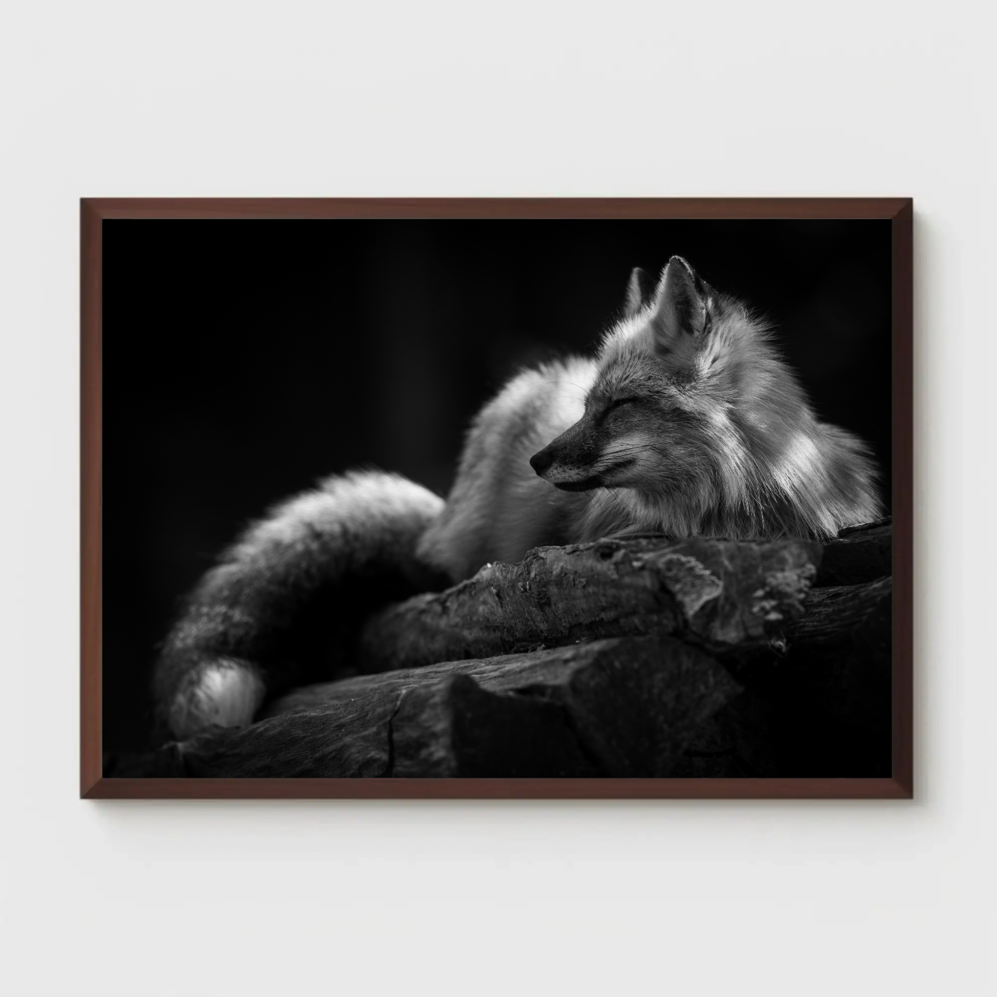Plongez dans l’univers délicat de « Fox Whisper », une œuvre en noir et blanc qui saisit un moment de sérénité absolue. On y découvre un renard, paisiblement allongé sur un tronc, les yeux clos, baigné dans une lumière douce qui accentue la texture de son pelage. Cette toile est une ode à la quiétude, au silence et à l’élégance discrète de la nature sauvage.