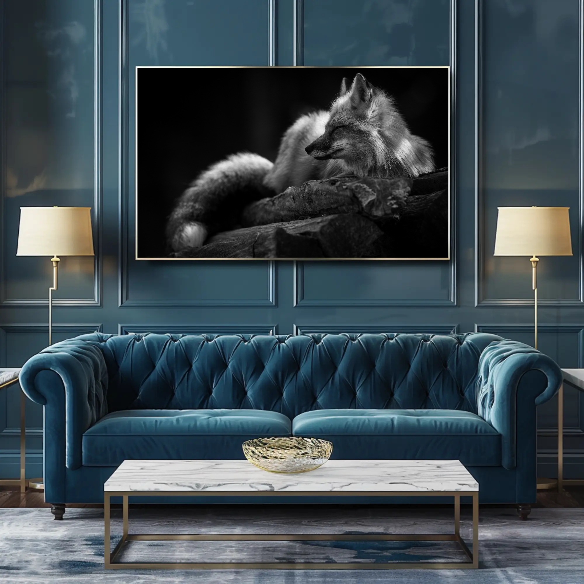 Idéale pour une décoration apaisante, « Fox Whisper » trouve parfaitement sa place dans une chambre à coucher, un espace de lecture ou un bureau méditatif. Pour enrichir votre décor mural, associez cette œuvre à « Black Lion » pour une puissance complémentaire ou à « White Duo » pour créer un contraste entre force et douceur.