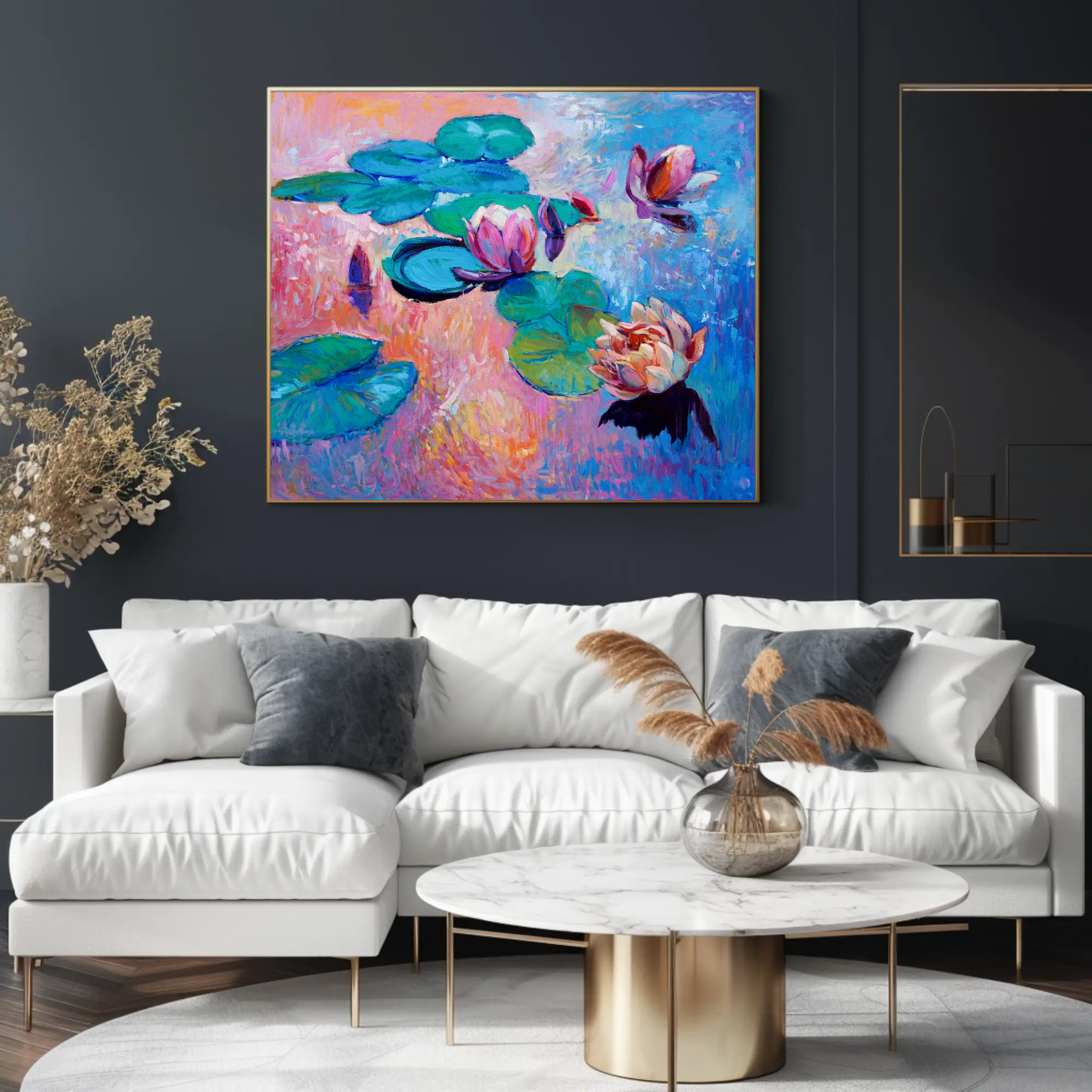 Cette œuvre trouve sa place dans un intérieur zen, romantique ou artistique. Elle est parfaite pour une chambre, un salon apaisant, un espace de lecture ou un hall de maison lumineux. « Nénuphars Chromatiques » apporte fraîcheur, beauté et équilibre à tout environnement.