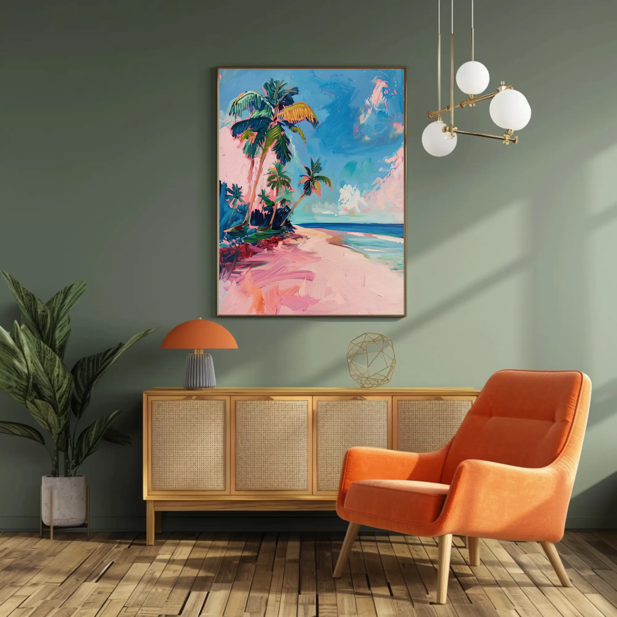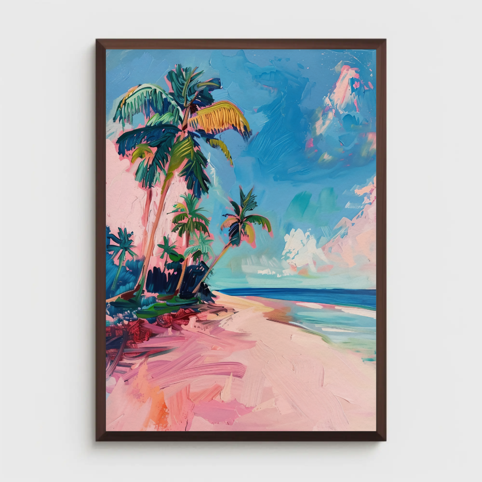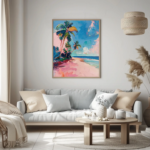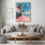 Plage Pastel est une ode à l’évasion et à la lumière. À travers ses larges coups de pinceau texturés et ses teintes joyeusement nuancées de bleu lagon, de rose poudré et de vert menthe, cette toile transporte l’esprit sur une plage lointaine et apaisante. Les palmiers vibrants et le ciel azur créent une scène presque onirique, parfaite pour une décoration murale moderne et rafraîchissante.