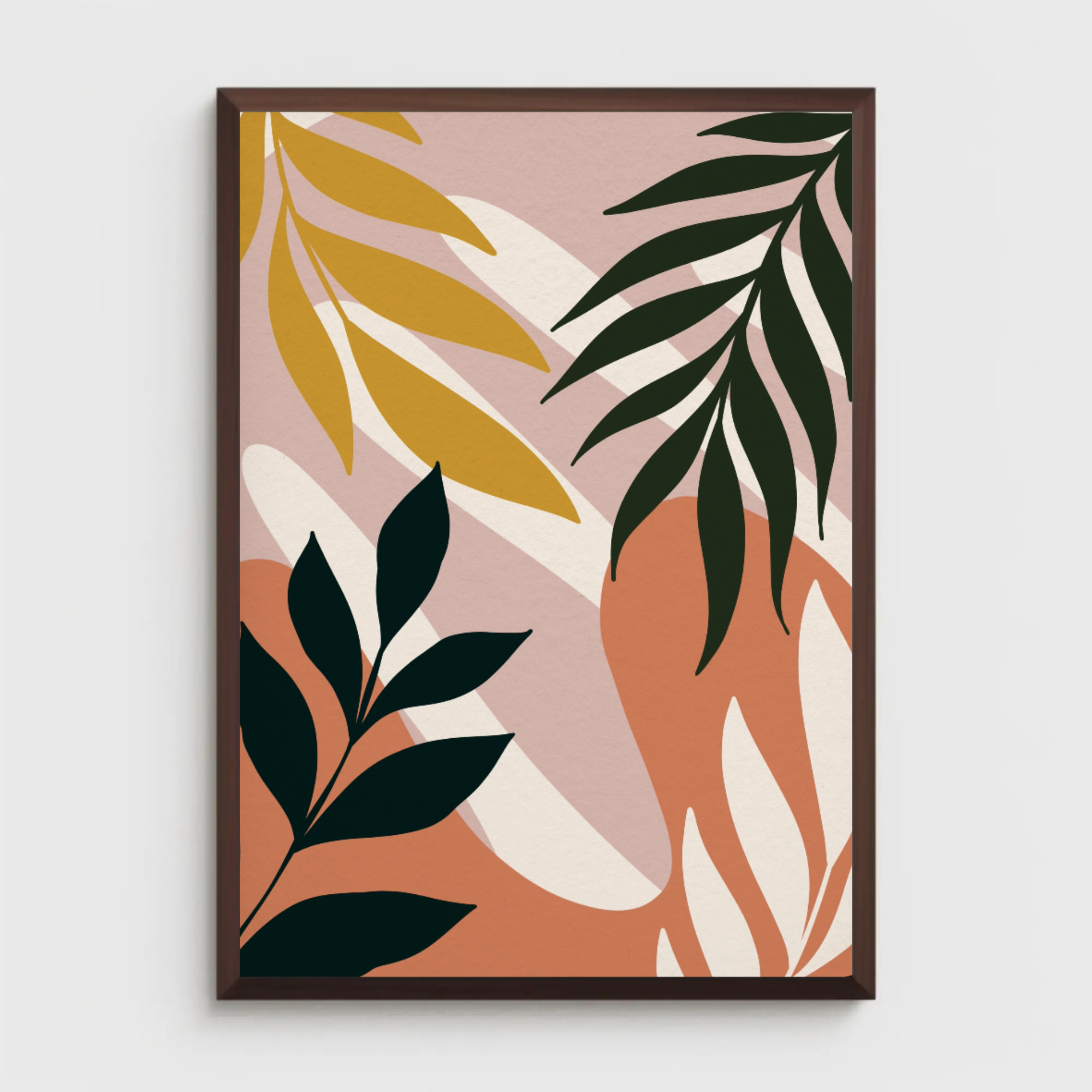 Un jeu de formes organiques et de feuillages minimalistes dans des tons ocre, olive et crème, parfaitement équilibrés autour d’un soleil doux. Cette toile moderne évoque la nature paisible et les instants suspendus.