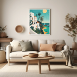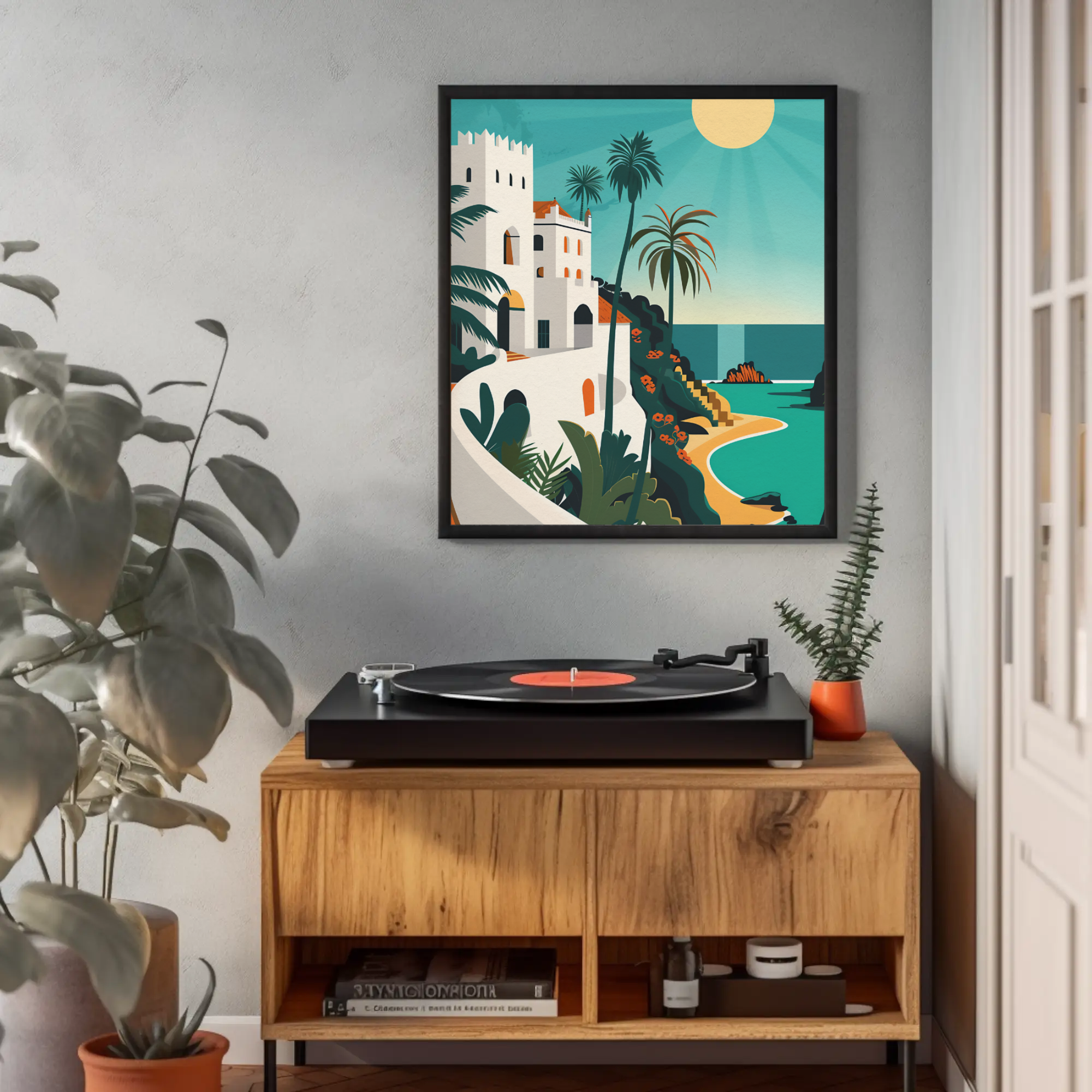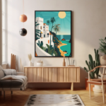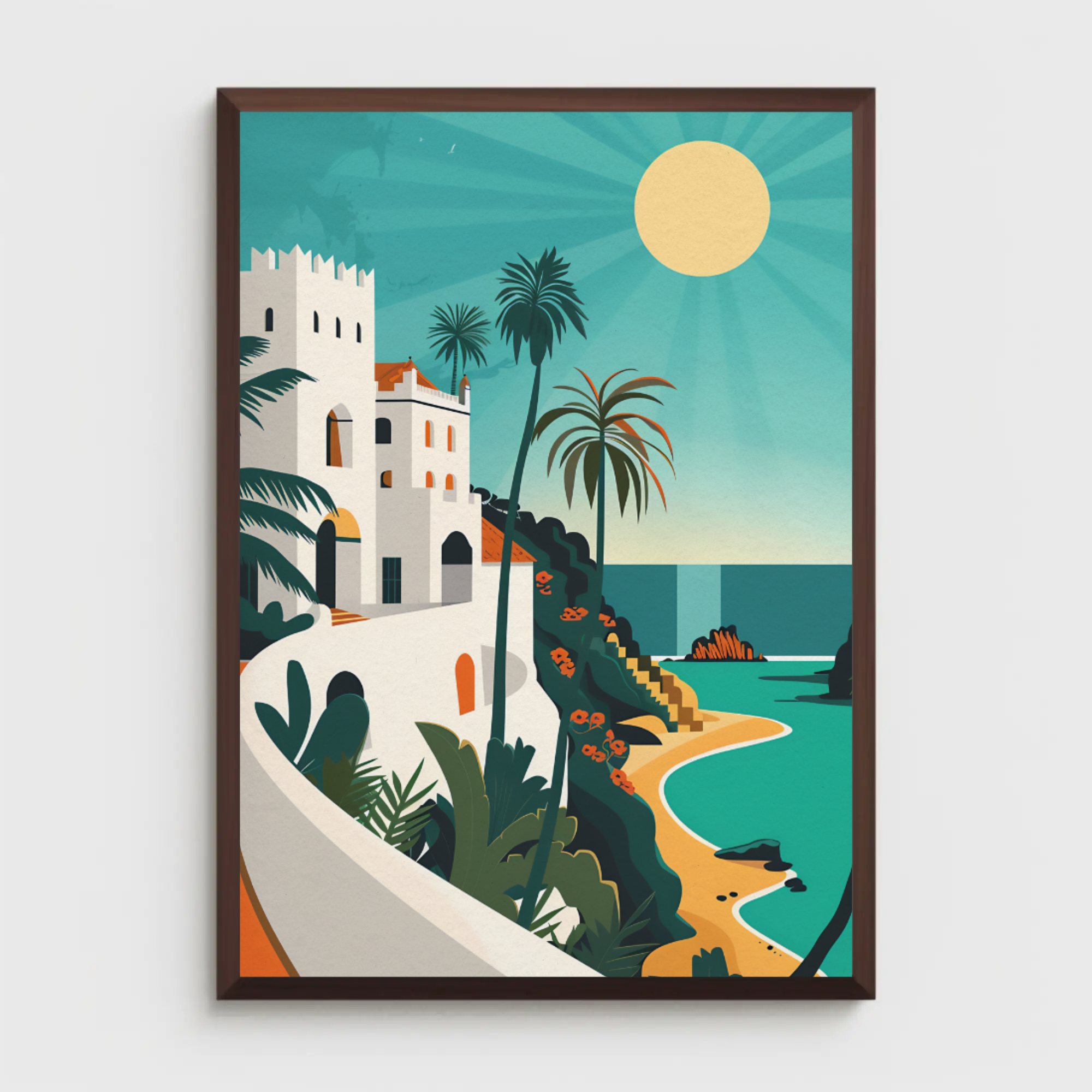Cette œuvre évoque l’élégance des côtes méditerranéennes avec ses palmiers élancés, ses escaliers ensoleillés et une mer turquoise envoûtante. Un tableau vibrant qui transforme votre intérieur en escapade estivale éternelle.