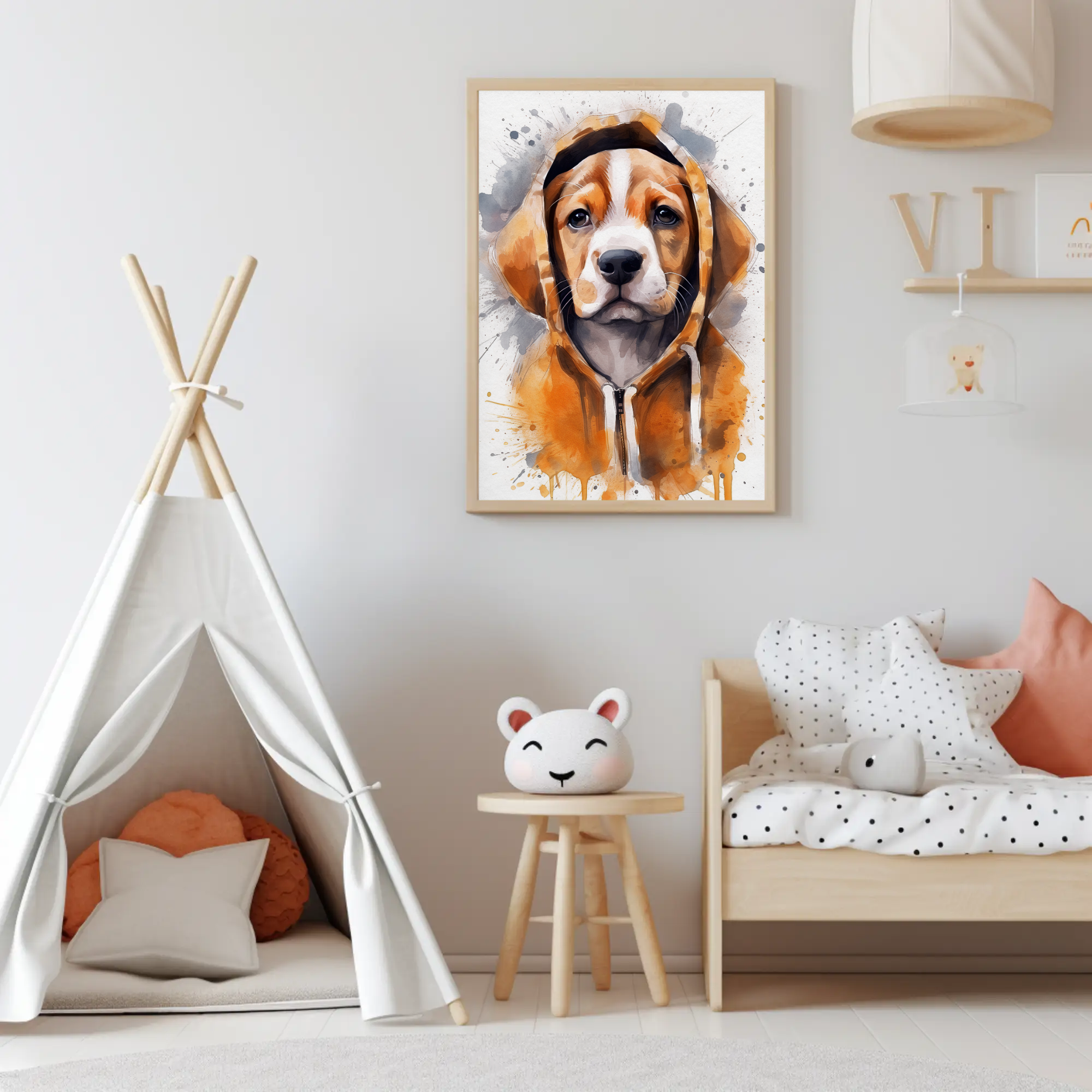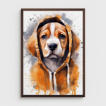 Un chiot beagle en sweat à capuche orange, peint en aquarelle urbaine. Une œuvre fun et moderne qui mélange tendresse et style streetwear.