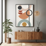 Cette composition minimaliste joue avec des cercles, demi-cercles et formes géométriques dans une palette douce de terracotta, vert-de-gris et noir sur fond blanc crème. L’équilibre visuel entre les éléments crée un rythme harmonieux et méditatif, évoquant un mobile suspendu dans un espace aérien et lumineux.