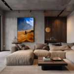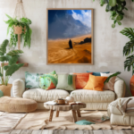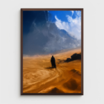 « Marcheur Bleu » est une toile contemplative qui capte un instant de solitude majestueuse dans un paysage désertique. On y voit une silhouette humaine, minuscule face à l’immensité des dunes dorées et des cieux bleus tempétueux. L’horizon semble s’étirer à l’infini, mêlant la chaleur brûlante du sable à la fraîcheur dramatique du ciel. Cette œuvre évoque le voyage, la résilience et la quête intérieure. Parfaite pour un intérieur minimaliste, un bureau inspirant ou un espace méditatif, « Marcheur Bleu » rappelle que chaque pas dans le silence du désert est aussi une avancée vers soi-même. Une pièce puissante, à la fois paisible et grandiose.