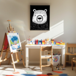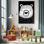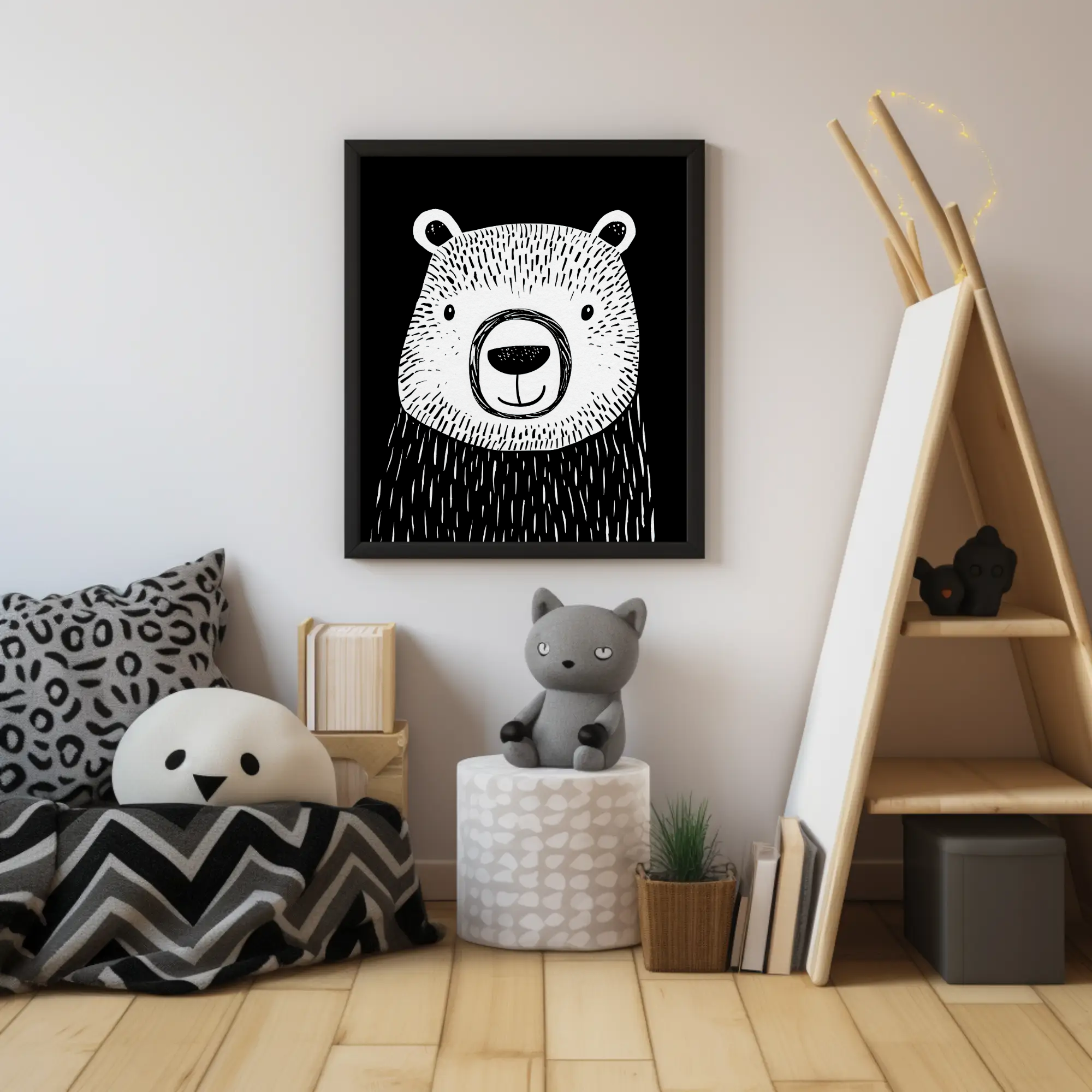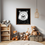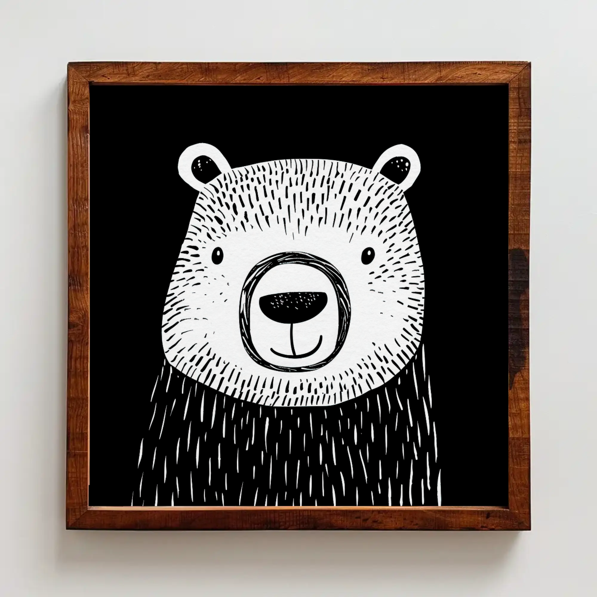 Un adorable ours dessiné en noir et blanc, au sourire naïf et rassurant — une œuvre parfaite pour apporter de la tendresse dans une chambre d’enfant ou un espace familial joyeux.