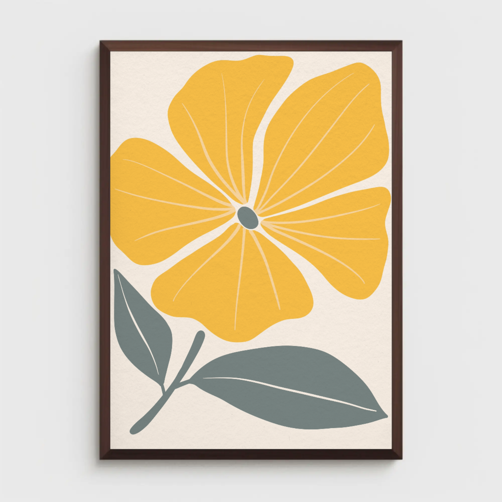 Un motif floral lumineux et minimaliste qui fusionne l’énergie du jaune éclatant avec la sérénité de feuilles vert olive, créant un tableau mural parfait pour illuminer n’importe quelle pièce de douceur.