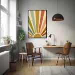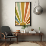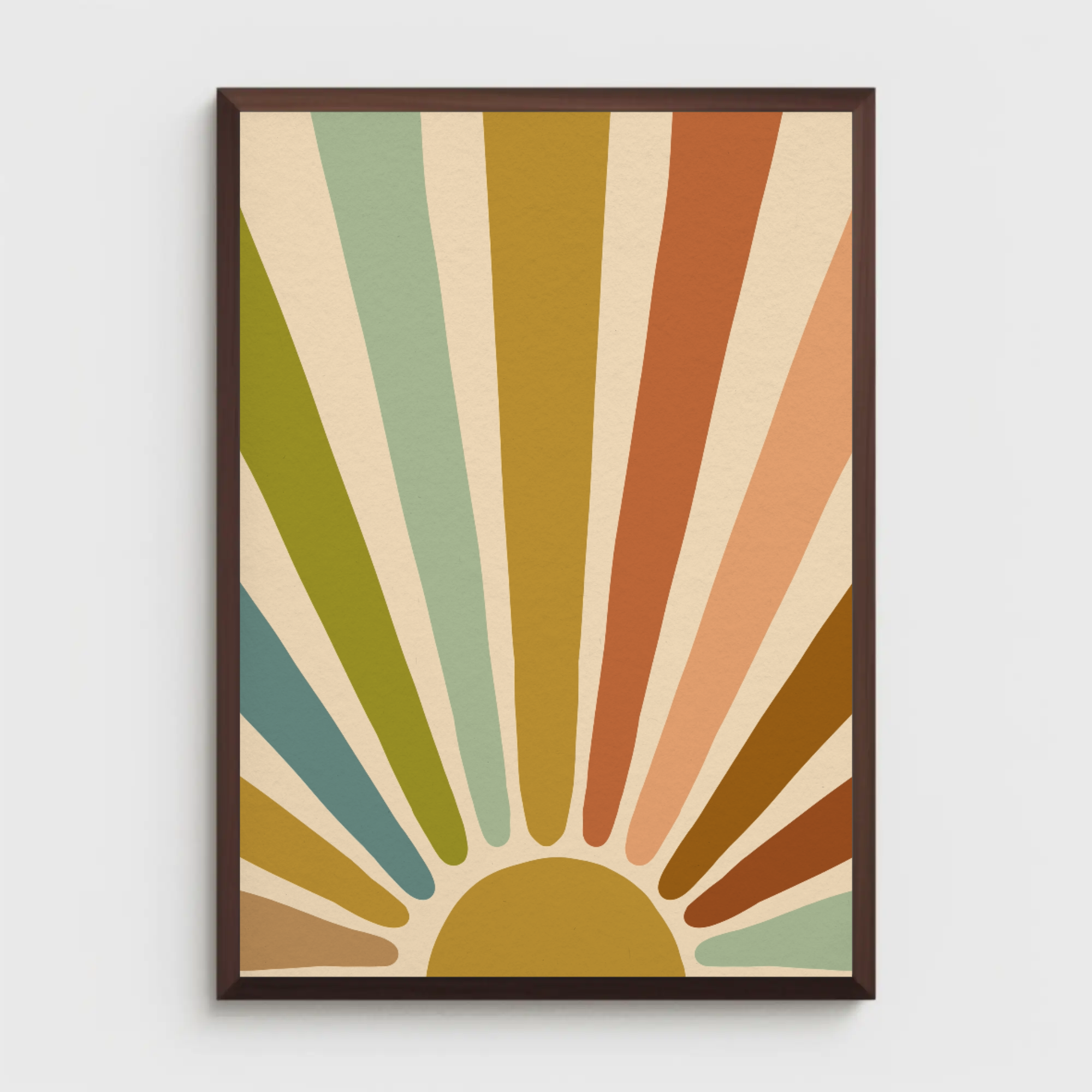 Cette toile vibrante rayonne de couleurs chaudes avec un soleil stylisé en demi-cercle, évoquant un lever de soleil vintage et lumineux. Parfaite pour insuffler énergie et chaleur à votre espace.